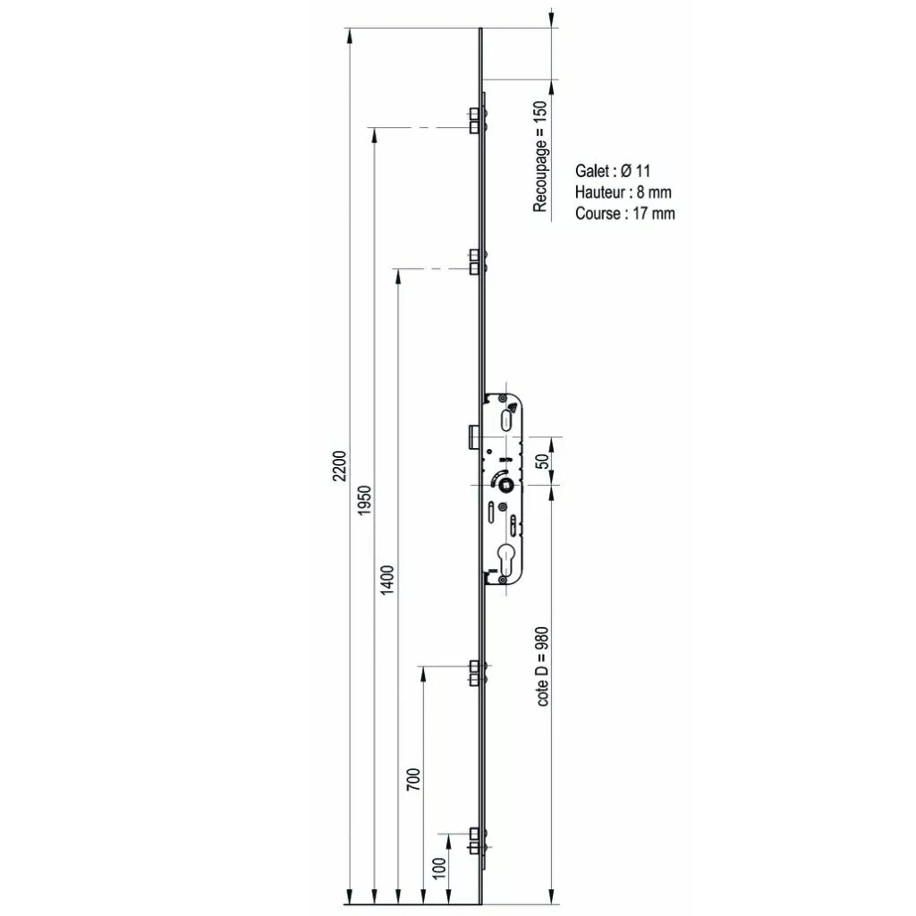 Crémone à rouleaux avec pêne demi-tour. Fermeture par relevage de la béquille.